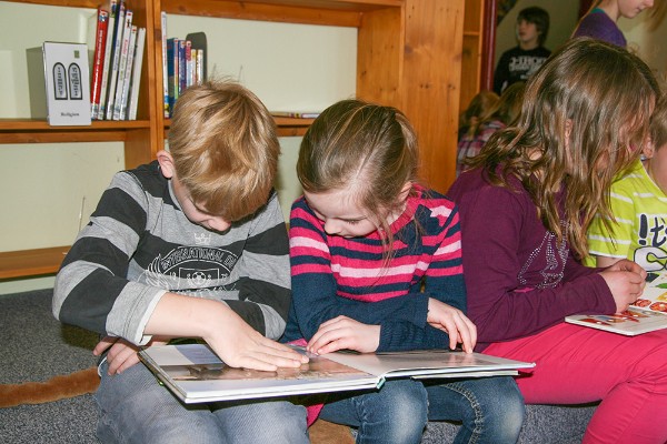Frau Sandra Hyda, Leiterin der 'Öffentlichen Kinderbücherei Horsten', empfängt hier einmal in der Woche die Schülerinnen und Schüler der Sonnensteinschule Horsten. Im wöchentlichen Wechsel kommen am Dienstag die Kinder des Kindergartens Etzel und des Sonnenstein-Kindergartens Horsten. Auch die Wurzelzwerge aus Horsten besuchen die Kinderbücherei regelmäßig dienstags.